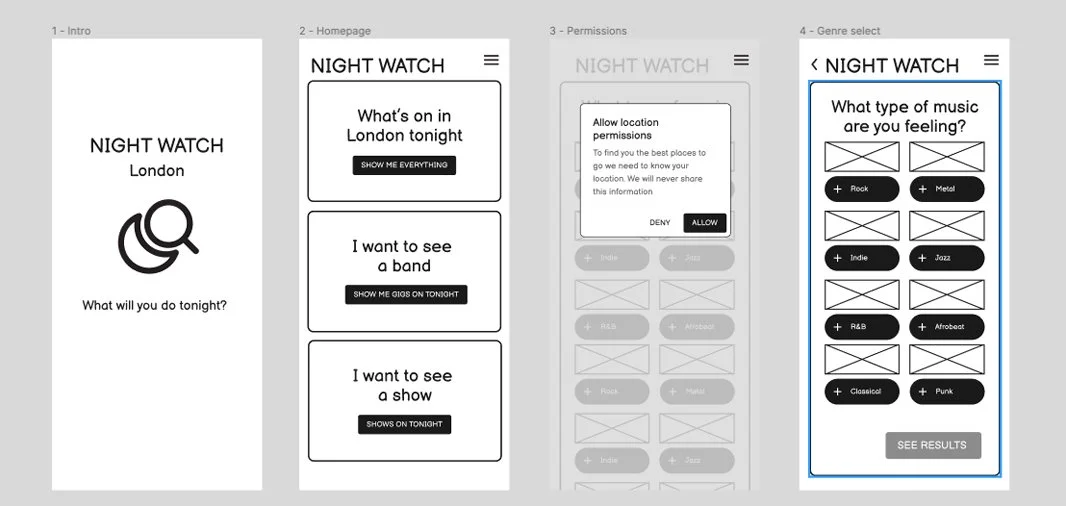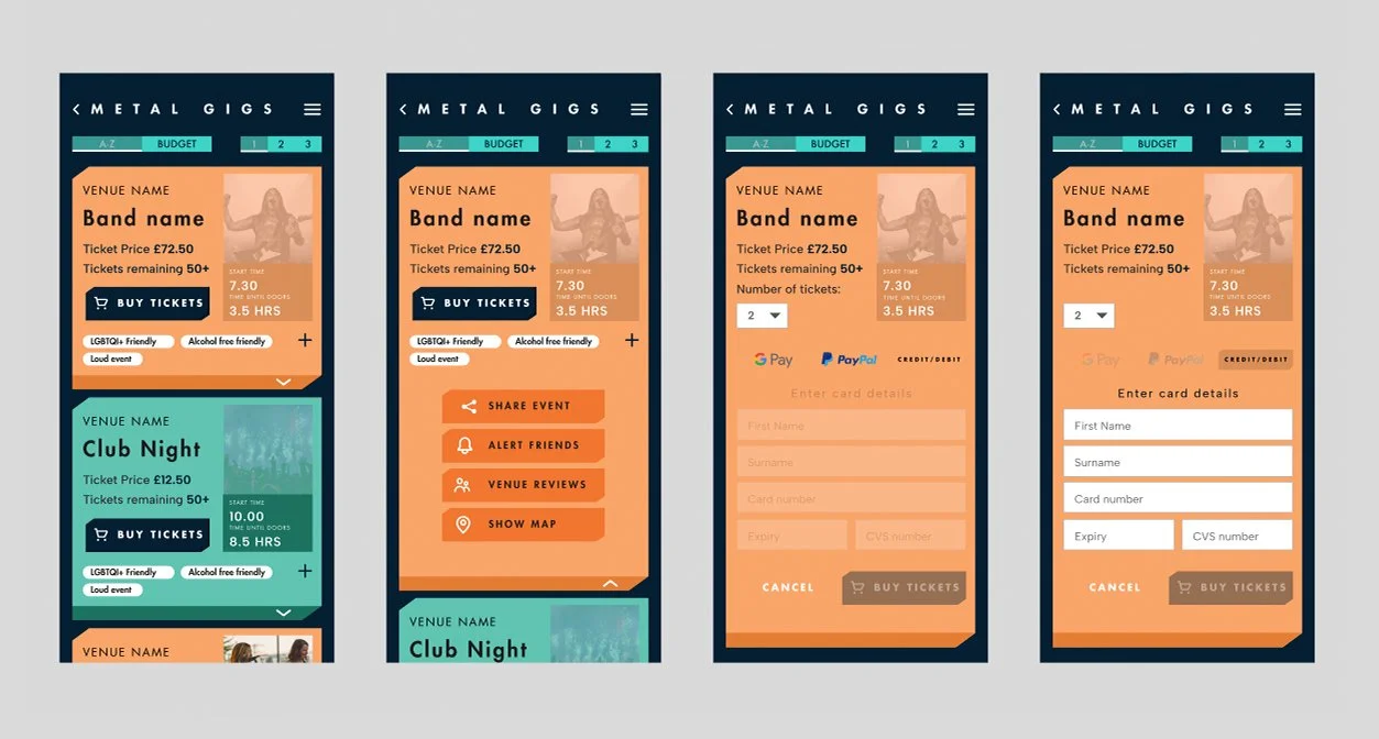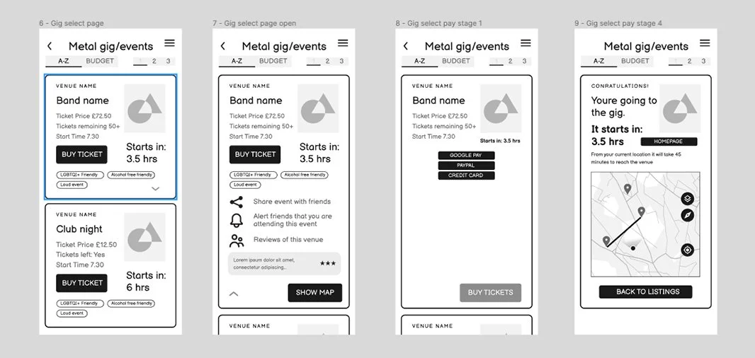 Thanks to the initial sketches I had a rough idea of the user flow to create wireframes to visualize the app's layout and user interface. Concentrating first on the Alex Mitchell persona, who is looking for a gig ticket or a night out in a metal club. One of these flows shows the user journey to buy a gig ticket, through to purchasing and then getting directions to the venue, and a time until the event countdown. The second one (after 7.30) shows finding a club night and getting directions (no purchase required)